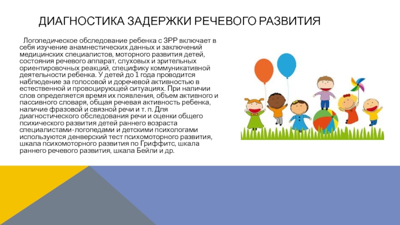 Слайд 11 Логопедическое обследование ребенка с ЗРР включает в себя изучение анамнестических