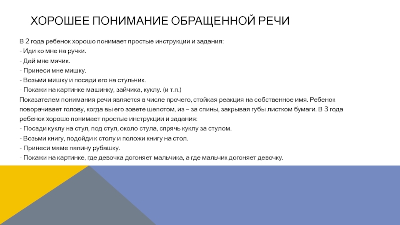 Показателем понимания речи является в числе прочего, стойкая реакция на собственное имя. Ребенок поворачивает голову, когда вы его зовете шепотом, из – за спины, закрывая губы листком бумаги. В 3 года ребенок хорошо понимает простые инструкции и задания: