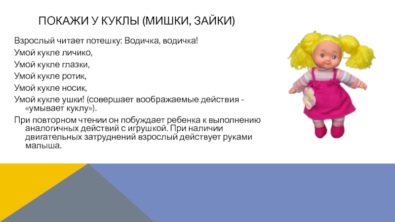 нужно ее покачать, сопровождая действия звукоподражанием: «а-а-а». Взрослый показывает игровые