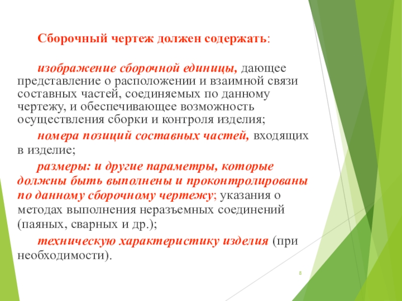 Слайд 8Сборочный чертеж должен содержать: