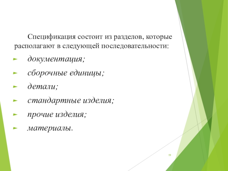 Слайд 19Спецификация состоит из разделов, которые располагают в следующей последовательности: