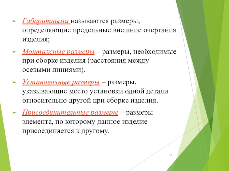 Слайд 13Габаритными называются размеры, определяющие предельные внешние очертания изделия;