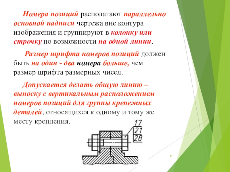 Слайд 11Номера позиций располагают параллельно основной надписи чертежа вне контура изображения