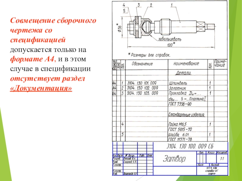 Слайд 23Совмещение сборочного чертежа со спецификацией допускается только на формате А4,