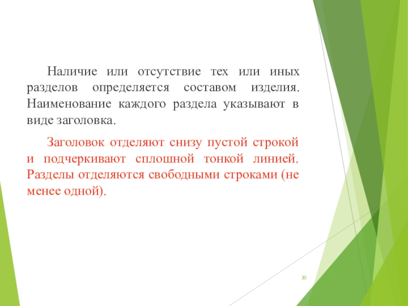 Слайд 20Наличие или отсутствие тех или иных разделов определяется составом изделия.