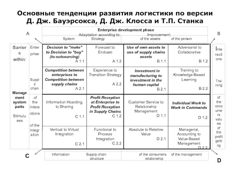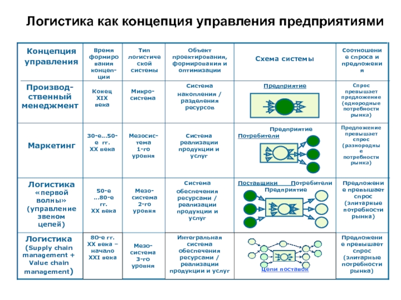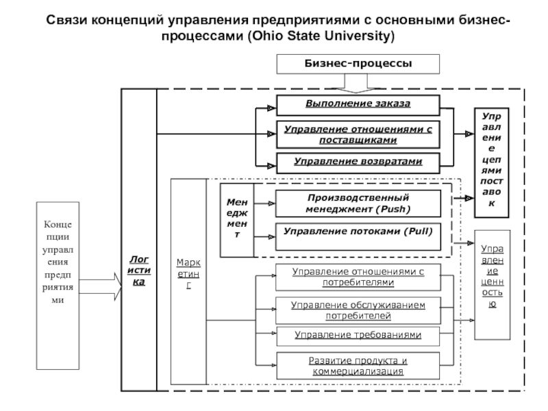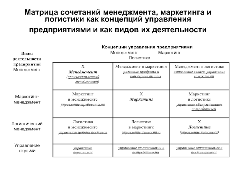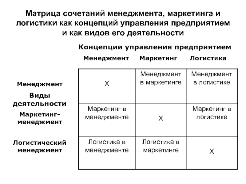 Слайд 23Матрица сочетаний менеджмента, маркетинга и логистики как концепций управления предприятием