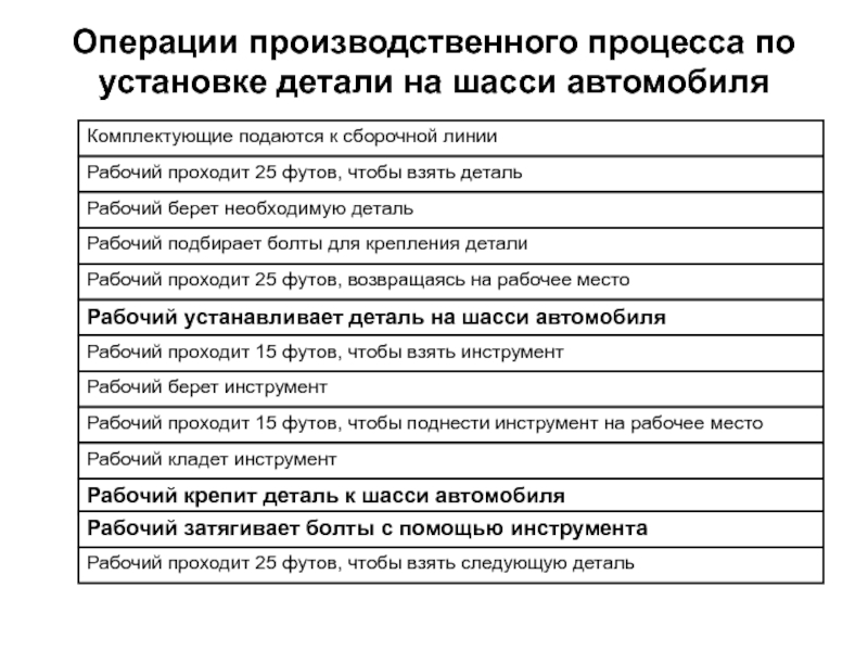 Слайд 12Операции производственного процесса по установке детали на шасси автомобиля