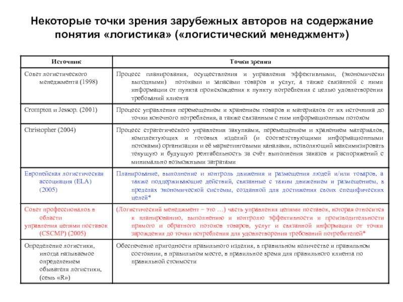 Слайд 18Некоторые точки зрения зарубежных авторов на содержание понятия «логистика» («логистический