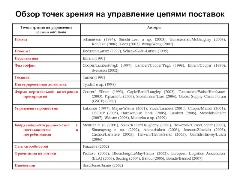 Слайд 20Обзор точек зрения на управление цепями поставок