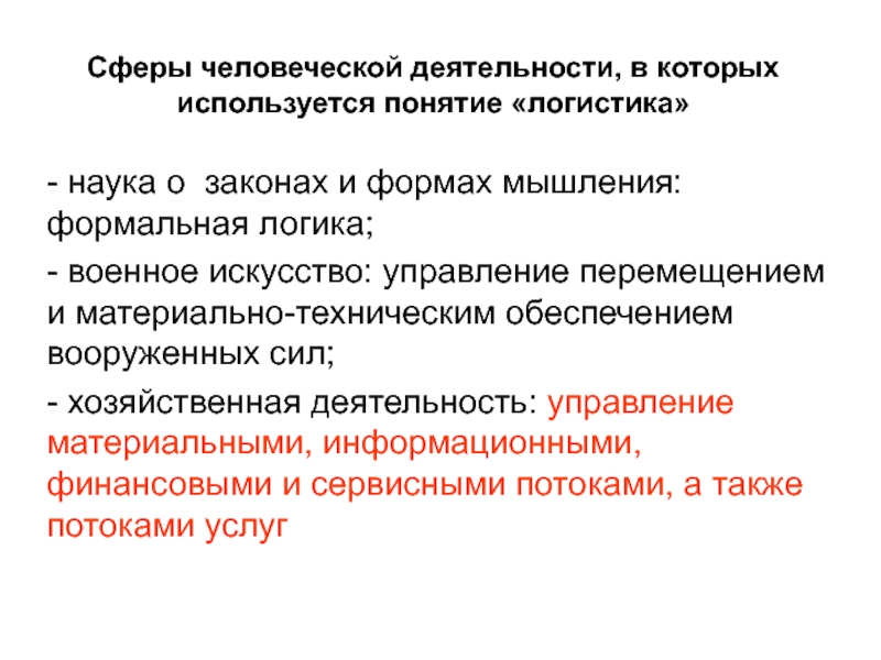 Слайд 16Сферы человеческой деятельности, в которых используется понятие «логистика»
