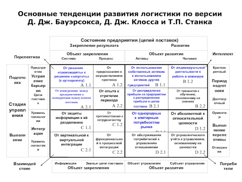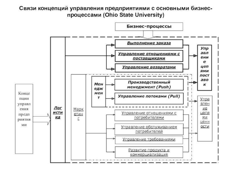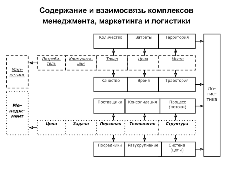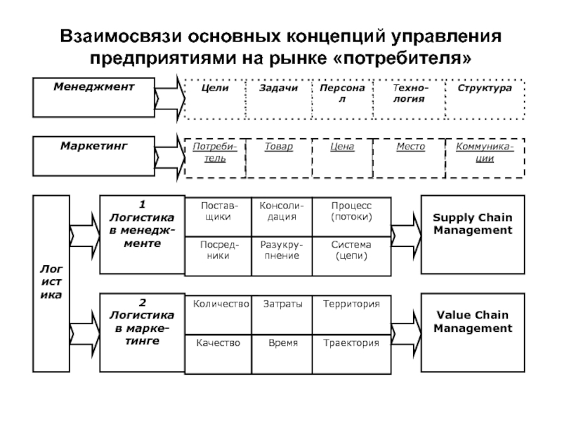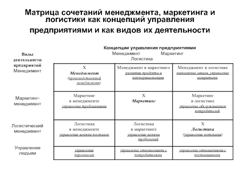 Слайд 24Матрица сочетаний менеджмента, маркетинга и логистики как концепций управления предприятием