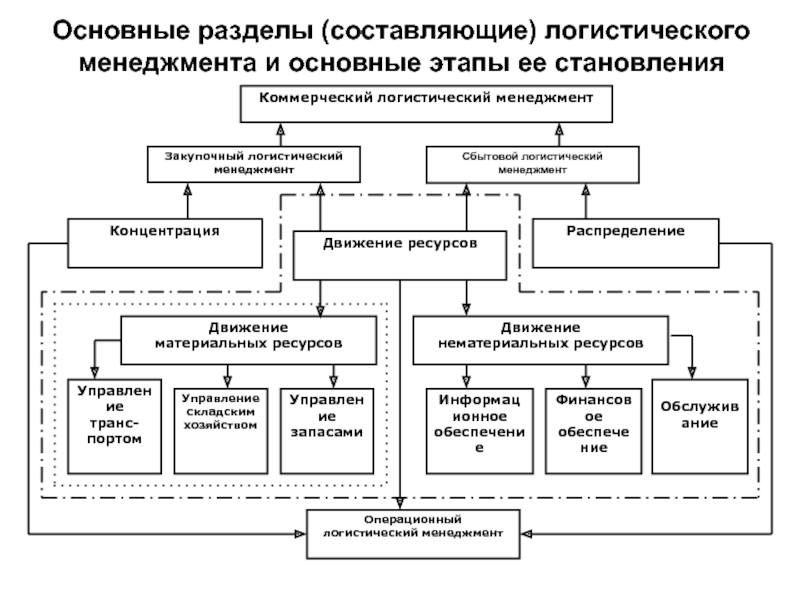 Слайд 55Основные разделы (составляющие) логистического менеджмента и основные этапы ее становления