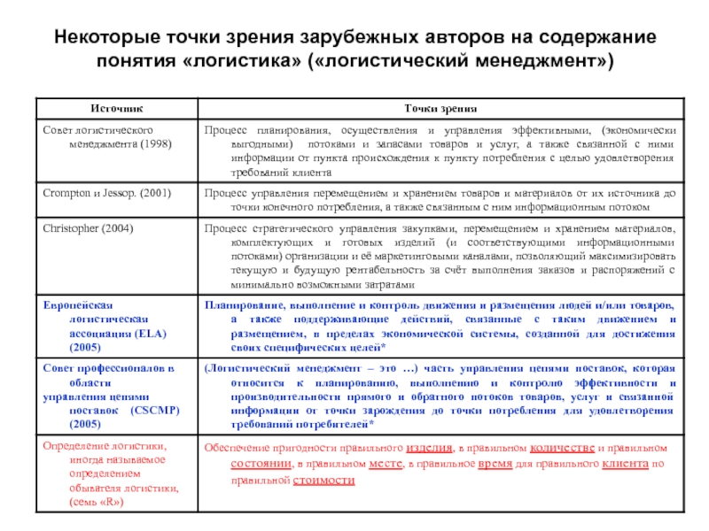 Слайд 17Некоторые точки зрения зарубежных авторов на содержание понятия «логистика» («логистический