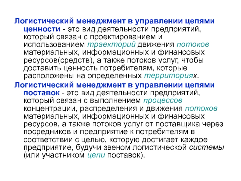 Логистический менеджмент в управлении цепями поставок - это вид деятельности предприятий, который связан с выполнением процессов концентрации, распределения и движения потоков материальных, информационных и финансовых ресурсов, а также потоков услуг от поставщика через посредников и предприятие к потребителям в соответствии с целью, которую достигает каждое предприятие, будучи звеном логистической системы (или участником цепи поставок).