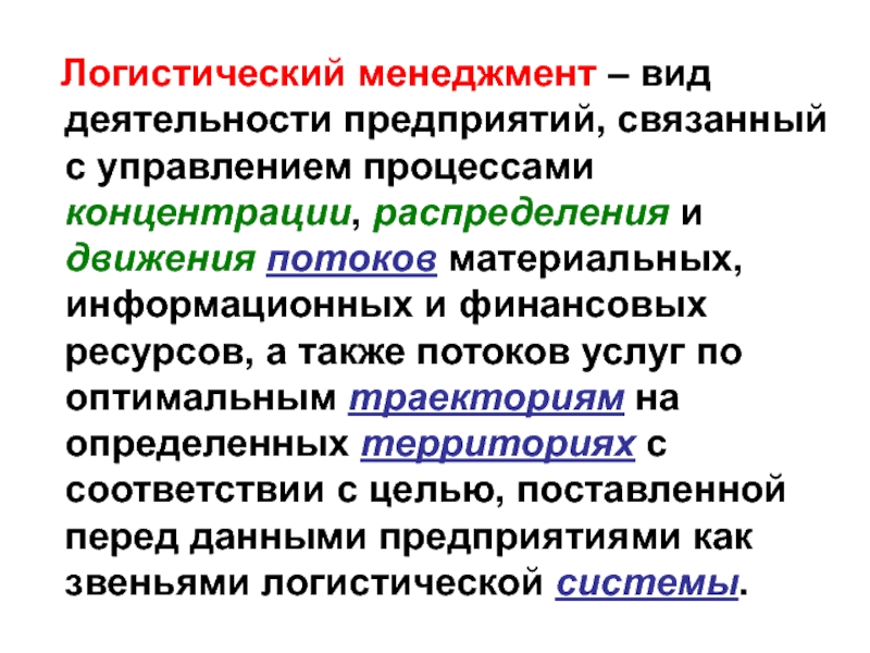 финансовых ресурсов, а также потоков услуг по оптимальным траекториям на определенных территориях с соответствии с целью, поставленной перед данными предприятиями как звеньями логистической системы.