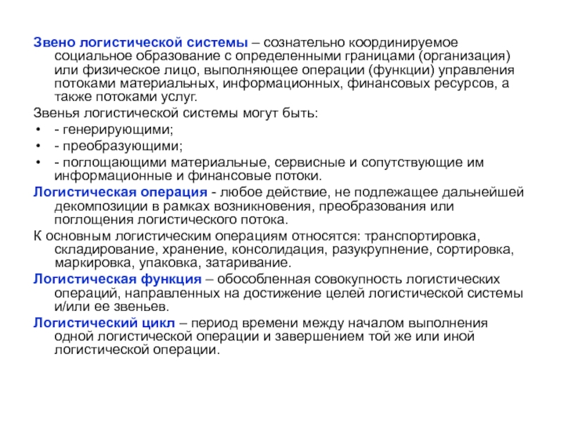 Слайд 82Звено логистической системы – сознательно координируемое социальное образование с определенными