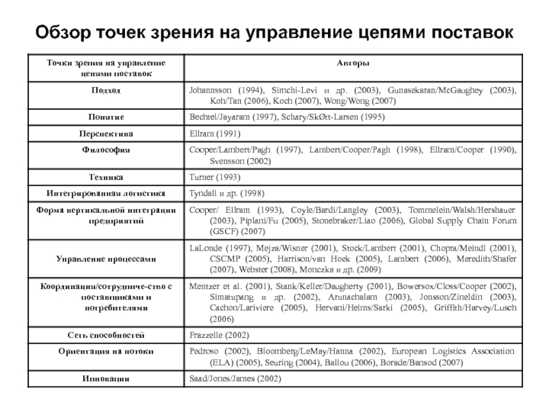 Слайд 20Обзор точек зрения на управление цепями поставок