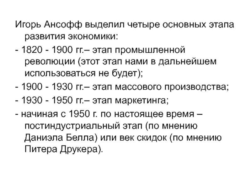 Слайд 22Игорь Ансофф выделил четыре основных этапа развития экономики: