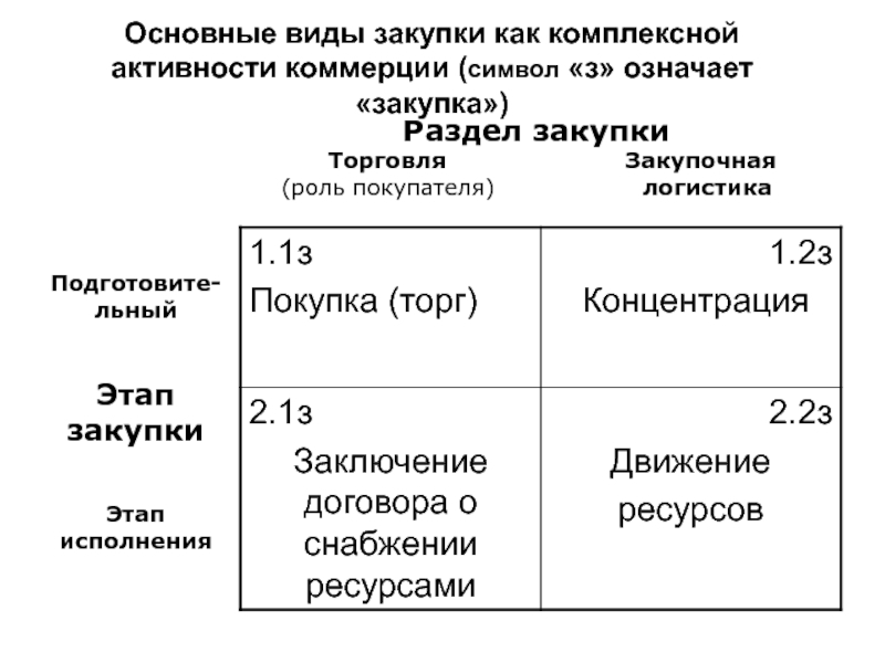 Слайд 60Основные виды закупки как комплексной активности коммерции (символ «з» означает