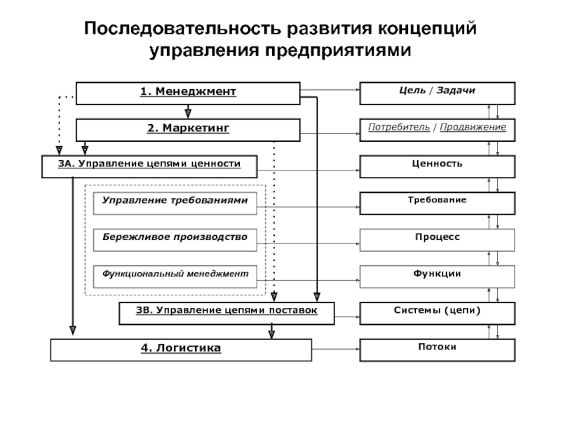 Ballou (2006): 1) закупка/управление материалами и физическое распределение; 2) логистика; (3) управление цепями поставок.