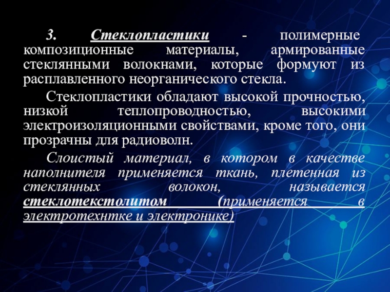 Слайд 163. Стеклопластики - полимерные композиционные материалы, армированные стеклянными волокнами, которые