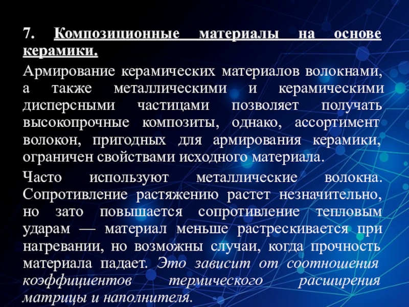 Часто используют металлические волокна. Сопротивление растяжению растет незначительно, но зато повышается сопротивление тепловым ударам — материал меньше растрескивается при нагревании, но возможны случаи, когда прочность материала падает. Это зависит от соотношения коэффициентов термического расширения матрицы и наполнителя.