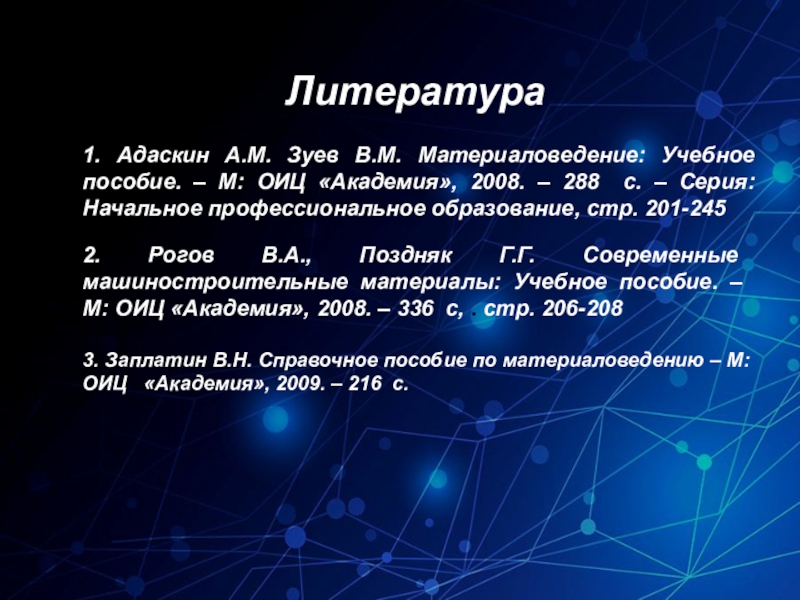 3. Заплатин В.Н. Справочное пособие по материаловедению – М: ОИЦ «Академия», 2009. – 216 с.