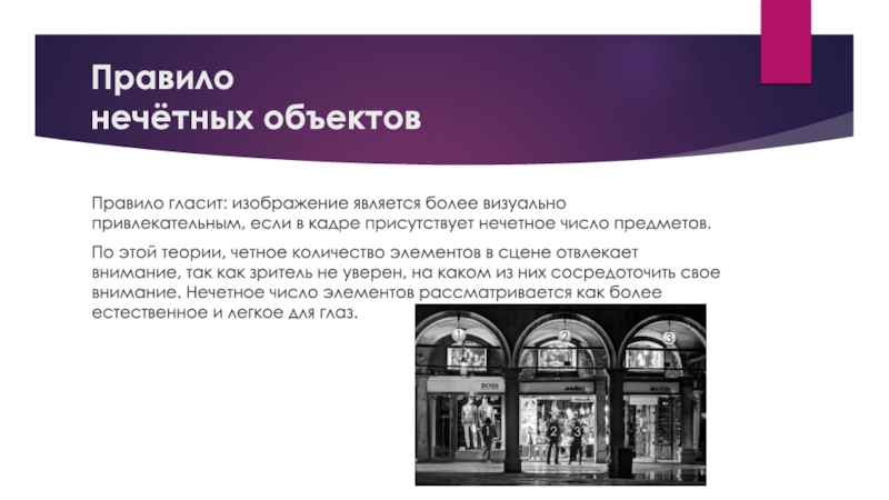 отвлекает внимание, так как зритель не уверен, на каком из них сосредоточить свое внимание. Нечетное число элементов рассматривается как более естественное и легкое для глаз.