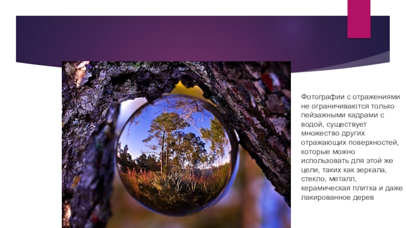 Слайд 17Фотографии с отражениями не ограничиваются только пейзажными кадрами с водой,