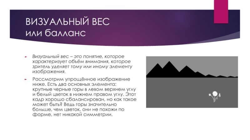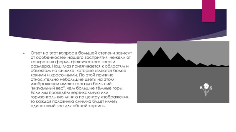 изображение ниже. Есть два основных элемента: крупные черные горы в левом верхнем углу и белый цветок в нижнем правом углу. Этот кадр хорошо сбалансирован, но как такое может быть? Ведь горы значительно больше, чем цветок, они не похожи по форме, нет никакой симметрии.