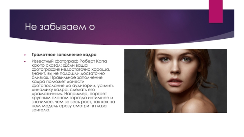 достаточно близко». Правильное заполнение кадра поможет донести фотопослание до аудитории, усилить динамику кадра, сделать его драматичным. Например, портрет крупным планом гораздо интимнее и значимее, чем во весь рост, так как на нем модель сразу смотрит в глаза зрителю.