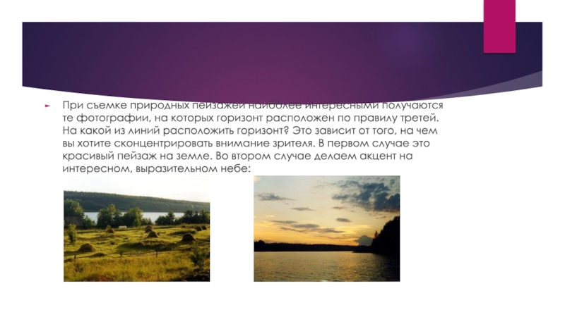 Слайд 31При съемке природных пейзажей наиболее интересными получаются те фотографии, на