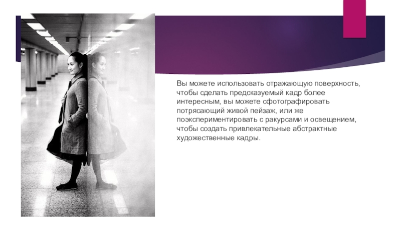 Слайд 18Вы можете использовать отражающую поверхность, чтобы сделать предсказуемый кадр более