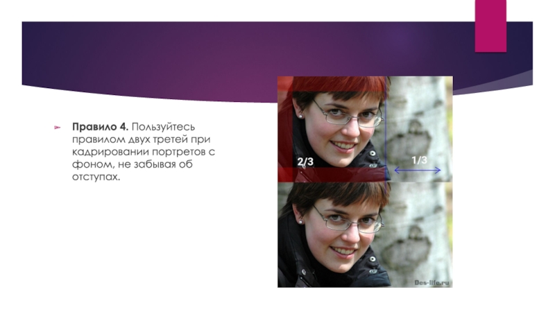 Слайд 43Правило 4. Пользуйтесь правилом двух третей при кадрировании портретов с фоном,