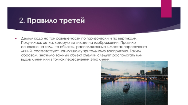 Правило основано на том, что объекты, расположенные в местах пересечения линий, соответствуют наилучшему зрительному восприятию. Таким образом, значимо важный объект съемки следует располагать или вдоль линий или в точках пересечений этих линий: