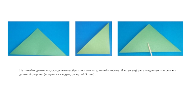 Слайд 4Не разгибая диагональ, складываем ещё раз пополам по длинной стороне.