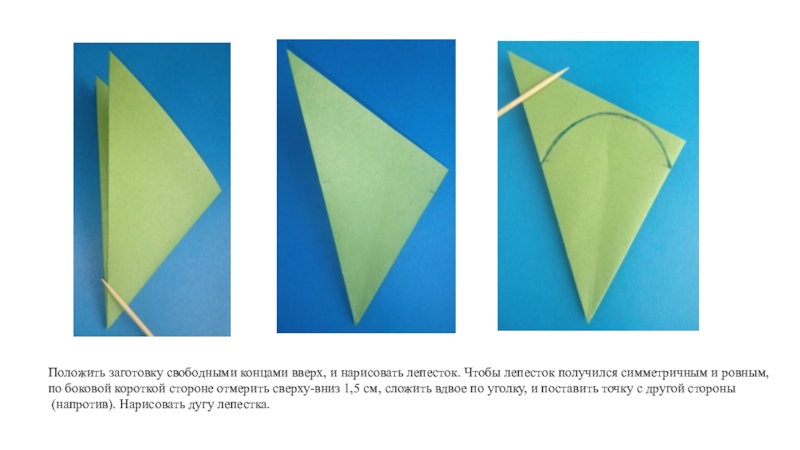 Слайд 5Положить заготовку свободными концами вверх, и нарисовать лепесток. Чтобы лепесток