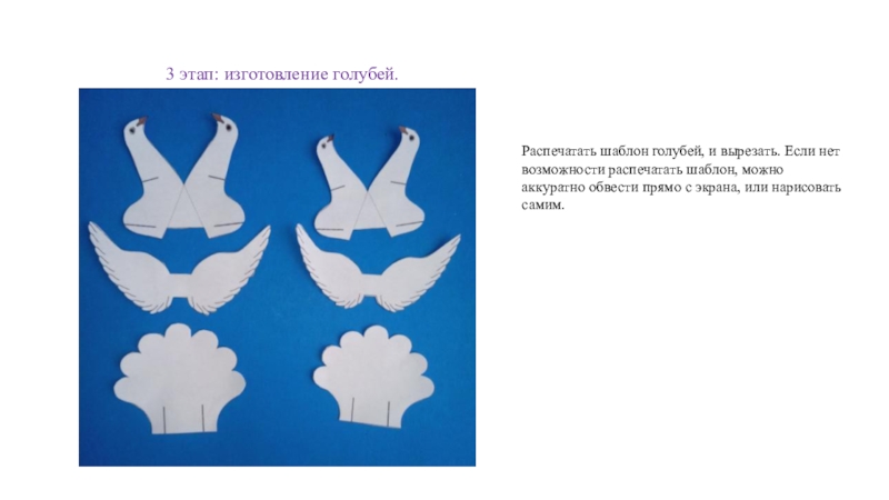 3 этап: изготовление голубей.Распечатать шаблон голубей, и вырезать. Если нет возможности распечатать шаблон, можно аккуратно обвести прямо