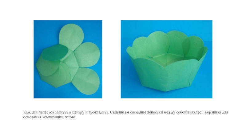 Каждый лепесток загнуть к центру и прогладить. Склеиваем соседние лепестки между собой внахлёст. Корзинка для основания композиции