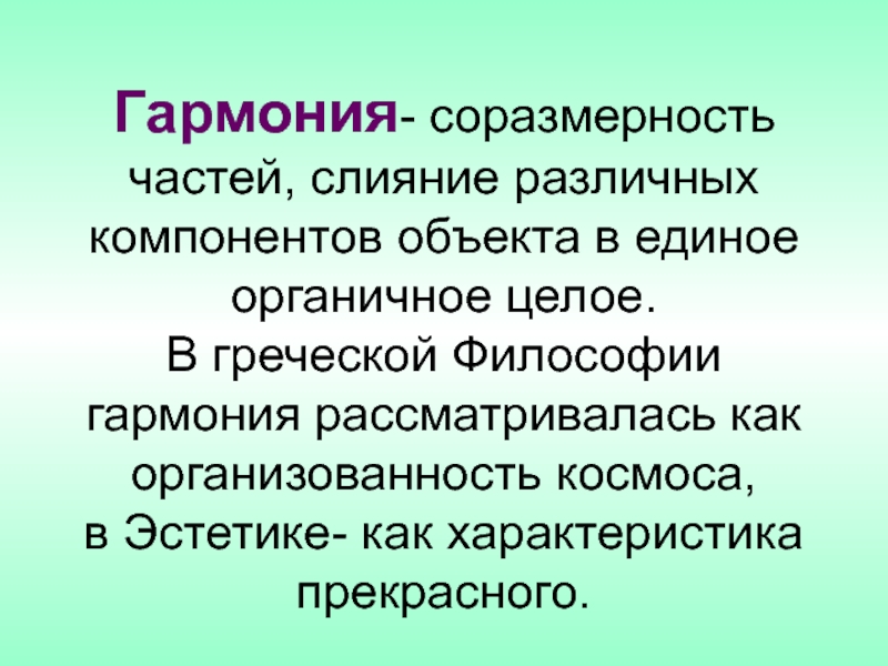 Слайд 10Гармония- соразмерность частей, слияние различных компонентов объекта в единое органичное