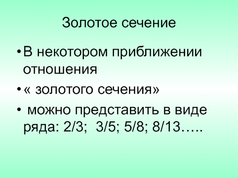 Золотое сечениеВ некотором приближении отношения « золотого сечения» можно представить в виде ряда: 2/3; 3/5; 5/8; 8/13…..