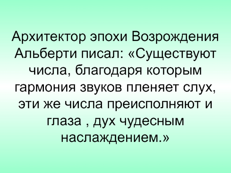 Слайд 15Архитектор эпохи Возрождения Альберти писал: «Существуют числа, благодаря которым гармония