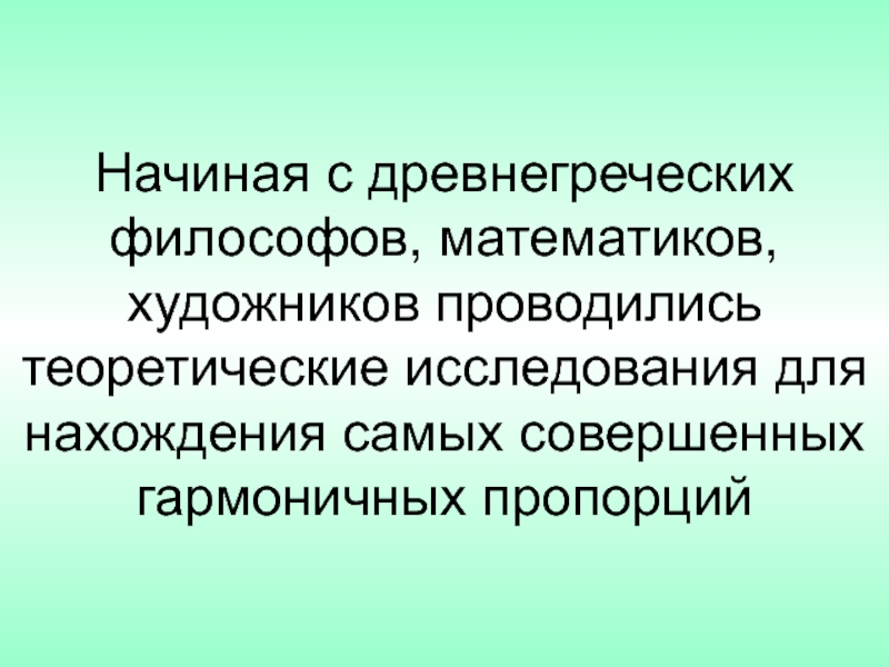 Слайд 8Начиная с древнегреческих философов, математиков, художников проводились теоретические исследования для