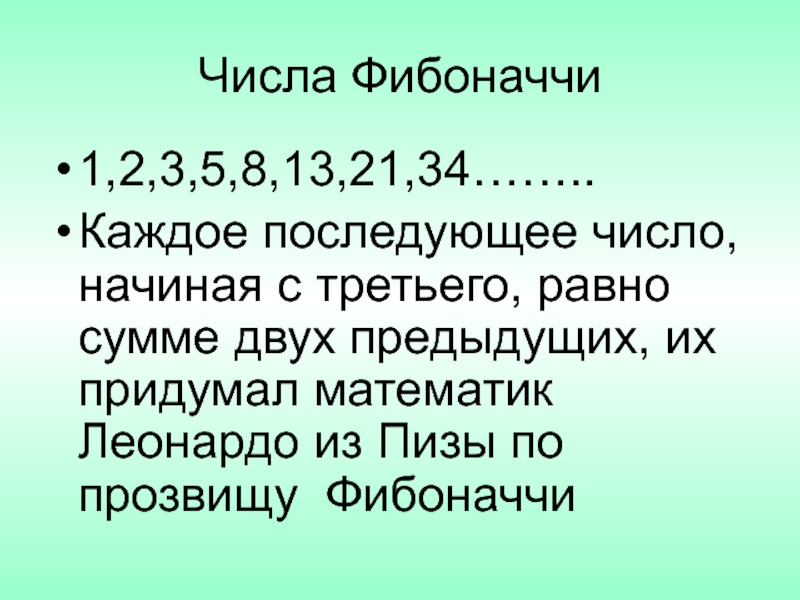 Числа Фибоначчи1,2,3,5,8,13,21,34……..Каждое последующее число, начиная с третьего, равно сумме двух предыдущих, их придумал математик Леонардо из Пизы