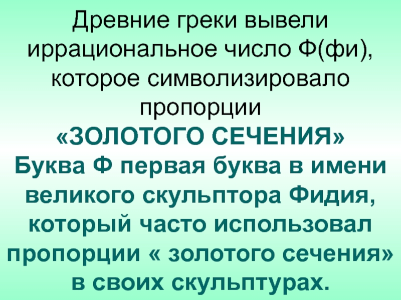Слайд 16Древние греки вывели иррациональное число Ф(фи),которое символизировало пропорции «ЗОЛОТОГО СЕЧЕНИЯ»