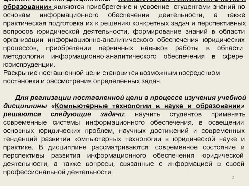 Для реализации поставленной цели в процессе изучения учебной дисциплины «Компьютерные технологии в науке и образовании» решаются следующие задачи: научить студентов применять современные системы информационного обеспечения, в освещении основных юридических проблем, научных достижений и современных тенденций развития компьютерных технологии в юридической науке и практике. В дисциплине рассматриваются: современное состояние и перспективы развития информационного обеспечения юридической деятельности, а также вопросы, связанные с информацией в своей профессиональной деятельности.