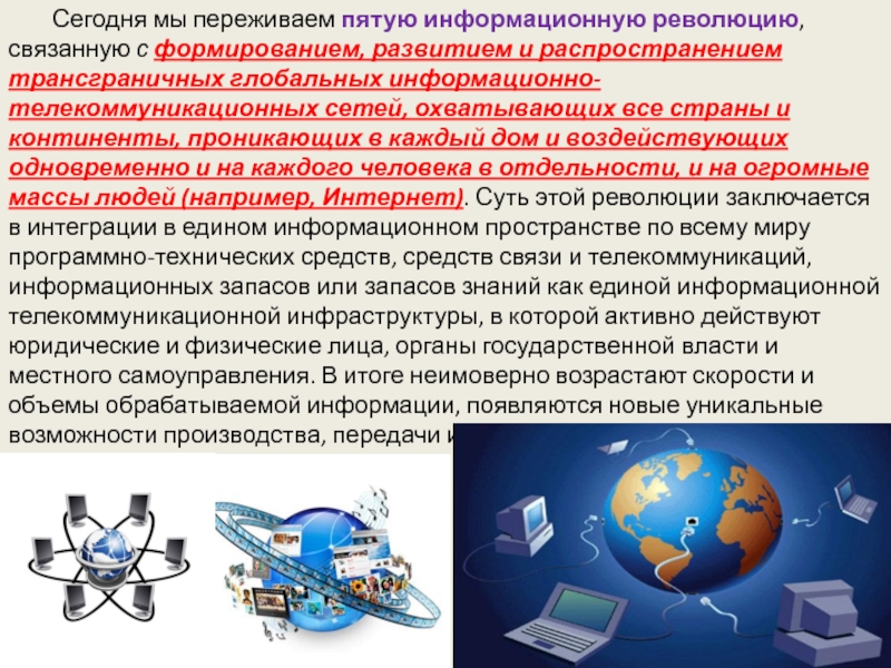 континенты, проникающих в каждый дом и воздействующих одновременно и на каждого человека в отдельности, и на огромные массы людей (например, Интернет). Суть этой революции заключается в интеграции в едином информационном пространстве по всему миру программно-технических средств, средств связи и телекоммуникаций, информационных запасов или запасов знаний как единой информационной телекоммуникационной инфраструктуры, в которой активно действуют юридические и физические лица, органы государственной власти и местного самоуправления. В итоге неимоверно возрастают скорости и объемы обрабатываемой информации, появляются новые уникальные возможности производства, передачи и распространения информации, поиска и получения информации, новые виды традиционной деятельности в этих сетях.