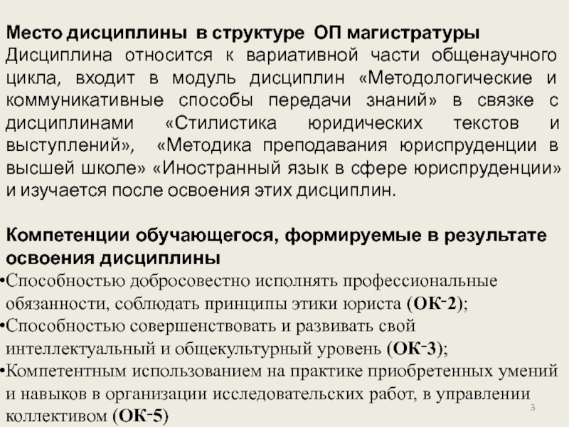Слайд 3Место дисциплины в структуре ОП магистратуры