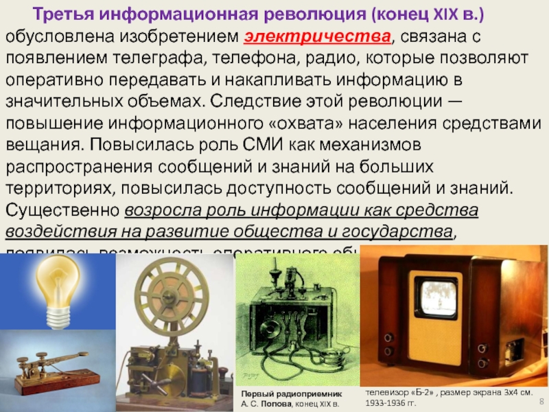 Слайд 8Третья информационная революция (конец XIX в.) обусловлена изобретением электричества, связана