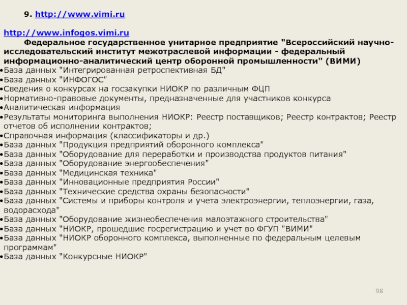 Основным информационным ресурсом портала ПРОМИНФО должна стать интегрированная база данных (метабаза) "Промышленный комплекс России", формирование которой возможно только во взаимодействии с другими порталами Минпромнауки и федеральными институтами, такими как: ВНТИЦЕНТР, МЦНТИ, организациями Гостандарта, Минсвязи, Минюста, Роспатента, Российской академией наук.